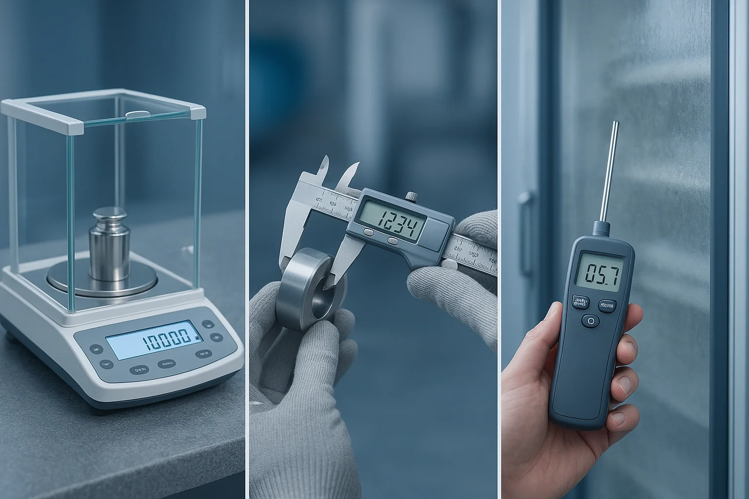 En la fabricación de piezas mecánicas, la exactitud en longitudes, diámetros y espesores define la funcionalidad del producto. Micrómetros, calibradores y máquinas de medición por coordenadas son instrumentos que deben mantenerse calibrados para garantizar tolerancias mínimas.