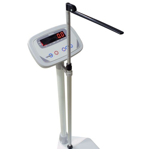 Bascula pesa personas con tallímetro marca Trumax, permite medir el peso corporal y la altura en un solo equipo, función de cálculo de índice de masa corporal, estructura tubular fabricada en aleación de acero, indicador solo peso con carcasa en ABS, capacidad máxima 300kg x 50g. Tallímetro telescópico de 75 a 203 cm.